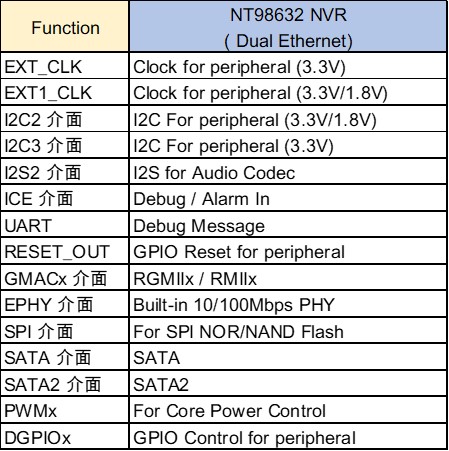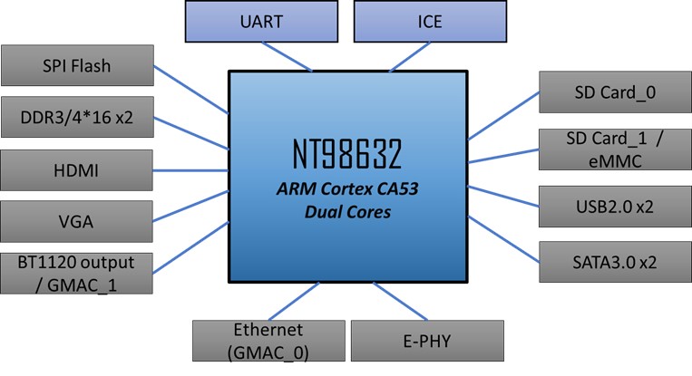 Novatek NT98632 是一款专为多路 H265 高清 NVR 系统设计的专业 SoC 芯片。它内置 ARM Cortex CA53 双核 CPU、H.264/H265 编解码器、MJPEG 编解码器、Novatek CNN Gen2 硬件加速器、2D 图形加速器引擎、多通道高清视频捕获、4K UHD 显示控制器、RGMII 以太网控制器和 10/100 以太网 PHY、USB2.0 端口、SATA3.0 接口,AMBA 总线架构,为用户提供高性能高清 NVR。同时 NT98632 还提供视频预处理和后处理,支持多格式视频输入应用 HD NVR 的高视频质量应用。
