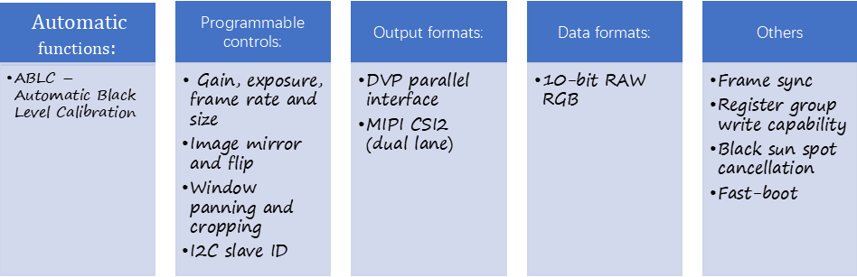 1. 主控cv1821规格:.单核ARM [email protected]; .图像视频90、180、270度旋转、Mirror、Flip; .MiPi接口; .9mm x 9mm QFN 封装大小; .集成 POR 、 ADC 、 I2C 、 SPI 、 UART 、PWM 、 SDIO 3.0 、 USB 2.0 Host/Device; .内置 DRAM;2 .sensor_soi_K302P规格:.4.1MP CMOS图像传感器; .分辨率:2696*1528; .10-bit RGB Raw Data; .Full: 2688x1520 @60fps .HDR: 2688x1520 @ 30fps .DVP并行和MIPI CSI2双数据通道串行接口;