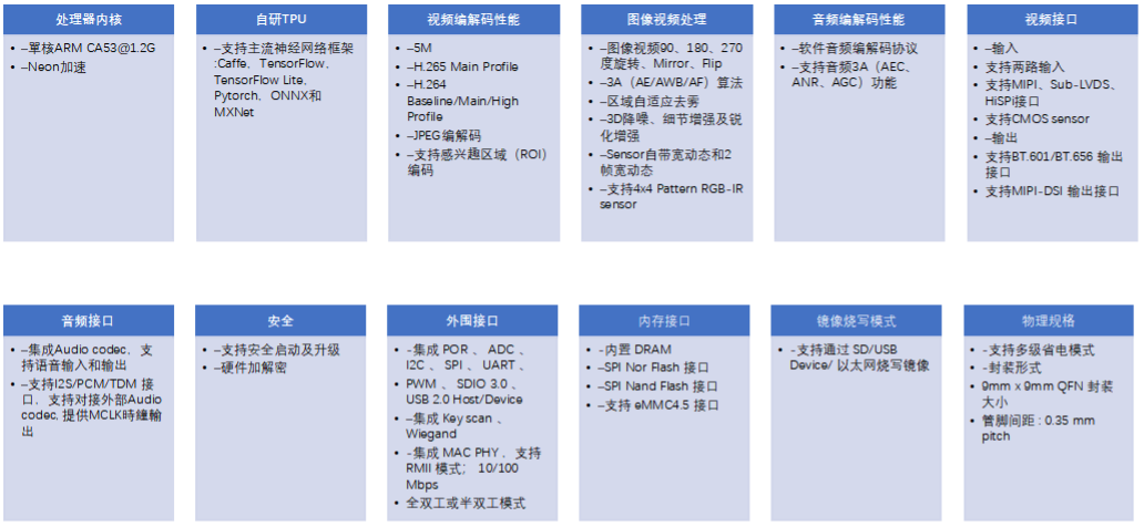 芯片更集成自研TPU在INT8运算下,可提供约0.5TOPS算力 。特殊设计的TPU调度引擎能有效地为张量处理器核心提供极高的带宽数据流 ;并为用户提供了强大的深度学习模型编译器和Linux软件SDK开发包,主流的深度学习框架,比如Caffe Pytorch ONNX MXNet 和TensorFlow(Lite) 框架的主流网络可以轻松的移植 到平台上 。