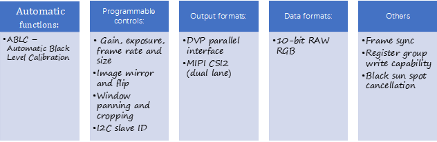 JX-Q03P是一款高性能的3.0MP BSI CMOS图像传感器,采用SOI的2.0um像素技术设计和制造。 JX-Q03P由一个2304x 1296的有源像素传感器(APS)阵列组成,具有片上10位ADC、可编程增益控制(PGA)和相关双采样(CDS)功能,可显着降低固定模式噪声(FPN)。该传感器还具有许多标准的可编程和自动功能。它同时支持符合行业标准的DVP并行接口和MIPI CSI2双数据通道串行接口。外部主机控制器可以通过标准串行接口访问该设备。该传感器以晶圆级封装的CSP形式提供.