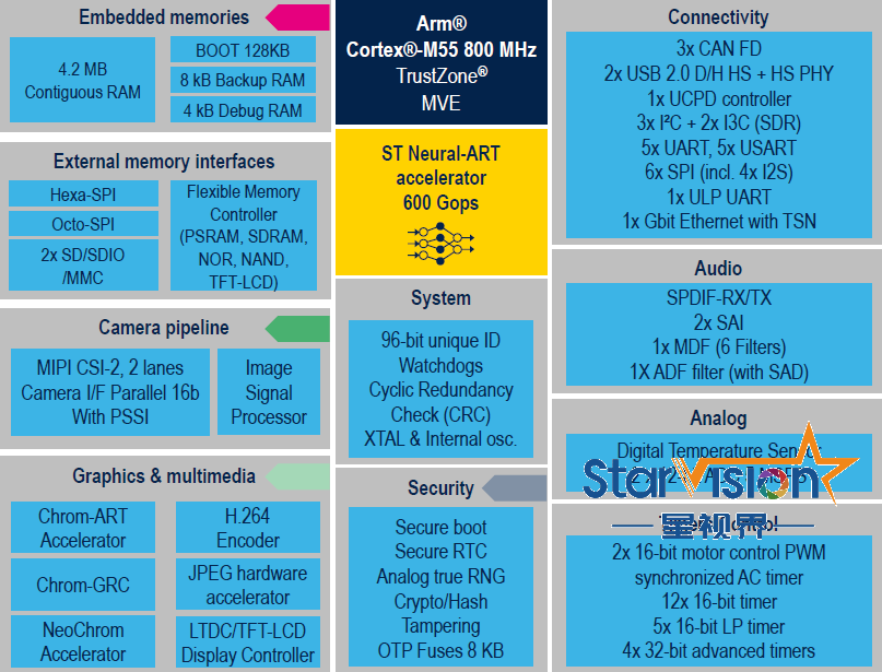 STM32N6 基于 Arm Cortex-M55 的微控制器,配备 ST Neuro-ART 加速器、H264 编码器、Neo-Chrom 2.5D 图形处理器、用于实时数据处理和多任务处理的 4.2MB 连续静态随机存取存储器、专用嵌入式神经处理单元(600 GOPS NPU 和 3 TOPS/W 功耗)、支持 5 个图像处理器 ISP(并行和 MIPI CSI-2 相机模块 I/F) Mpixel 相机和 30 FPS、坏像素、下采样、黑电平、曝光、去马赛克、列转换、对比度、裁剪、缩放、伽马值、像素打包。